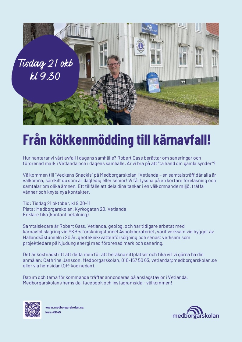 Vår samtalsledare är Robert Gass, Vetlanda, geolog, och har tidigare arbetat med kärnavfallslagring vid SKB:s forskningstunnel Äspölaboratoriet, varit verksam vid bygget av Hallandsåstunneln i 20 år, geoteknik/vattenförsörjning och senast verksam som projektledare på Njudung energi med förorenad mark och sanering.